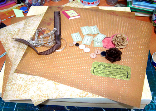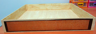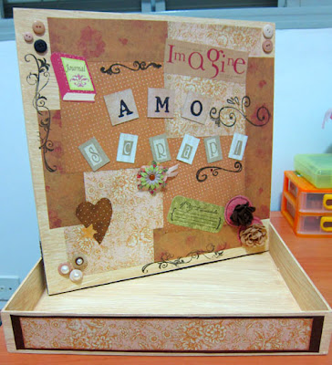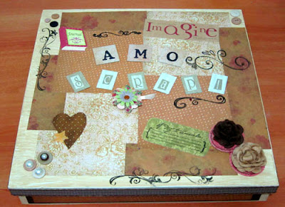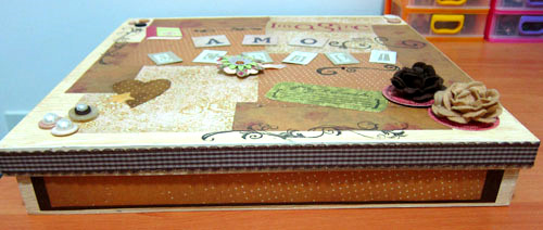 Usei uma  caixa de mdf com 34 x 34 cm, ideal para guardar folhas de scrap. Você vai precisar de papéis para scrapbooking, fitas, flores, journaling, carimbo, botões,  pérolas e chipboard de alfabeto.